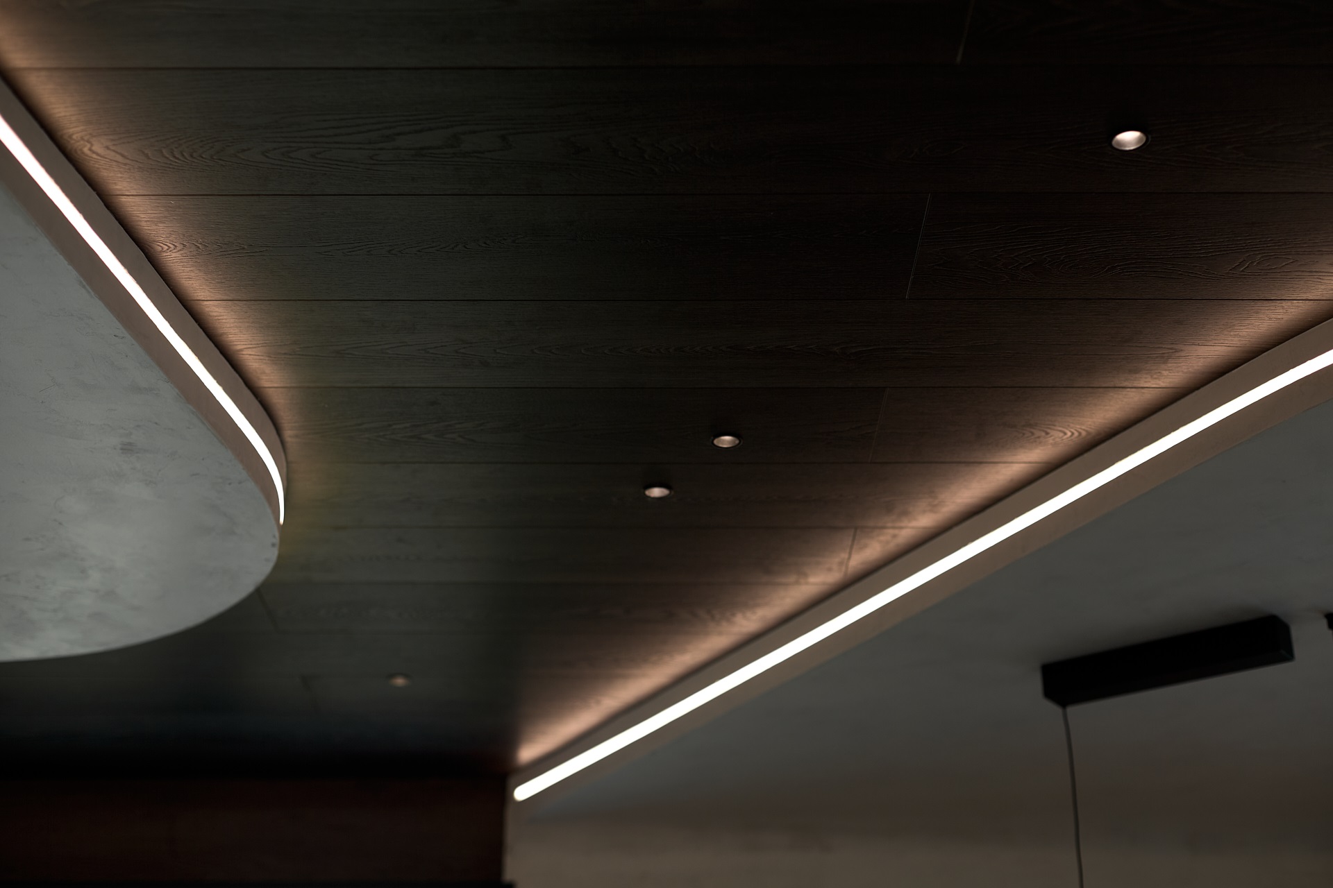 За тёмную сторону отвечал кварцевый ламинат, а для контрастных светлых пятен использовали микроцемент.